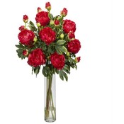 Nearly Natural Peony Silk Flower Arrangement with Cylinder Red